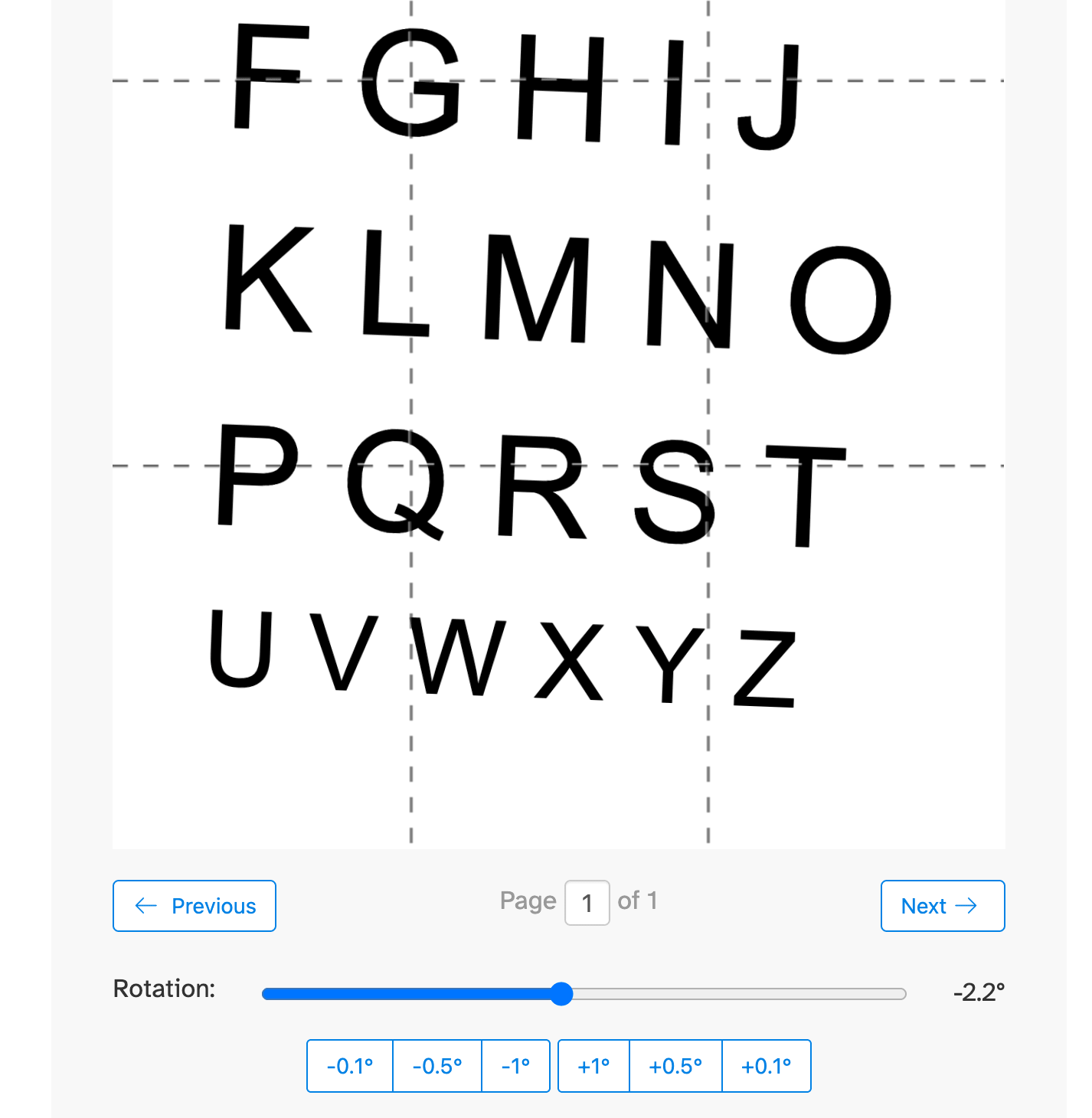 في الوضع اليدوي، كل صفحة تظهر مع شريط تدوير وأزرار ضبط سريع (±0.1°, ±0.5°, ±1°) عشان تضبط زاوية التصحيح بدقة. تنقل بين الصفحات باستخدام أزرار 'Previous' و 'Next' وعدل كل صفحة لحالها.