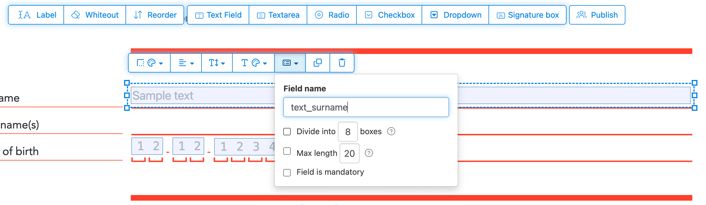 Use the alignment tools to line up multiple form fields with each other. Align by left, right, top, or bottom edge for a clean, professional layout.