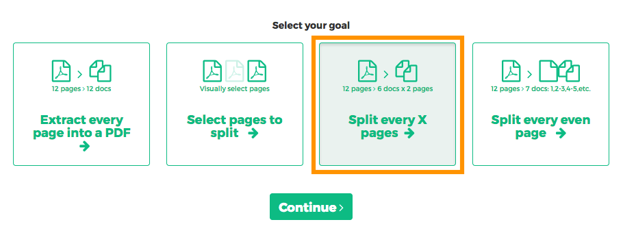 Want to extract every two pages into a new PDF? An example would be an original 12 pages document being split into 6 smaller documents, having 2 pages each. First document has pages 1 and 2, next one has pages 3 and 4 and so on.